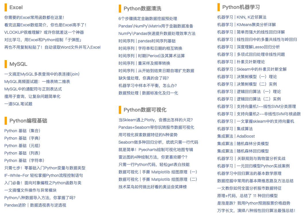 近一年内一直坚持分享160+篇超高质量原创好文。公众号以Python为核心语言,垂直于数据科学领域,分享大量知识总结及实战项目经验,包括Python/Excel/MySQL等数据分析、可视化、机器学习、数据挖掘等领域。从入门到进阶!每篇文章源数据和源码均可免费获取!