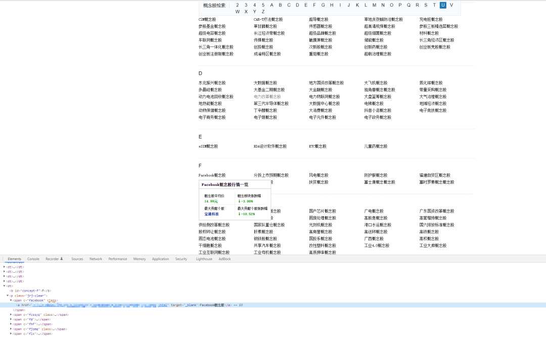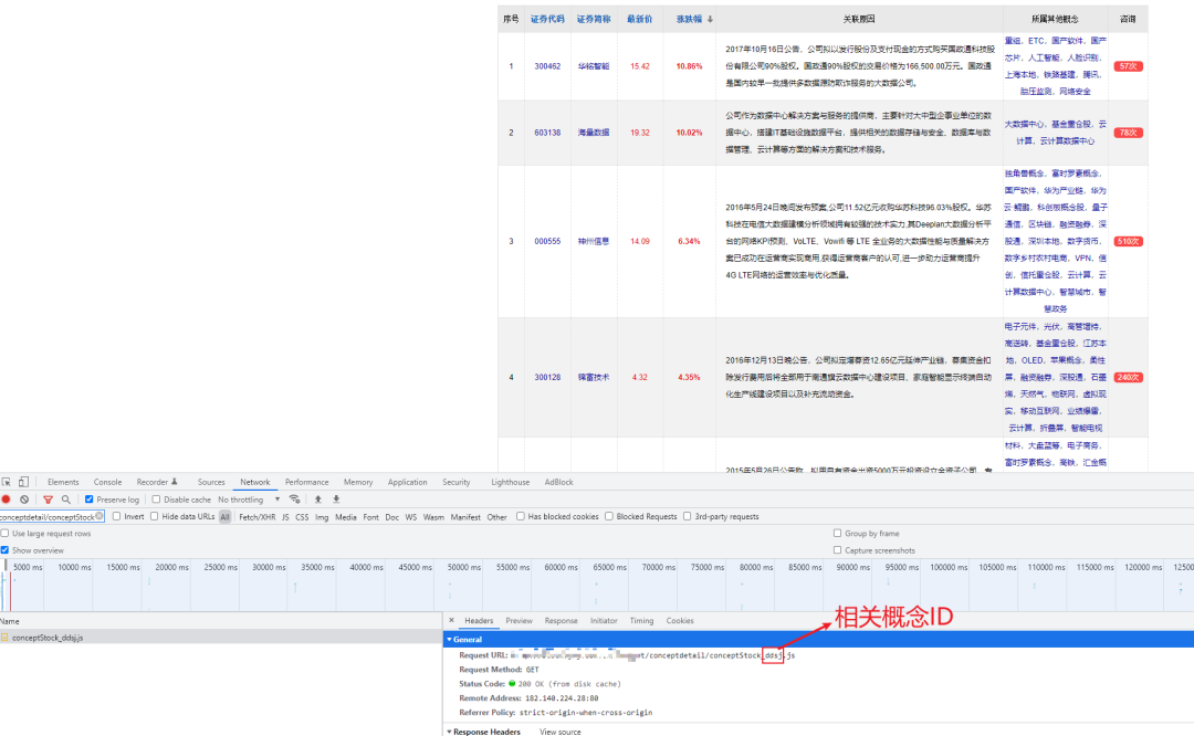 分析个股列表页面后,发现列表数据来源于 JS 文件,URL 中的变量为上面的概念 ID