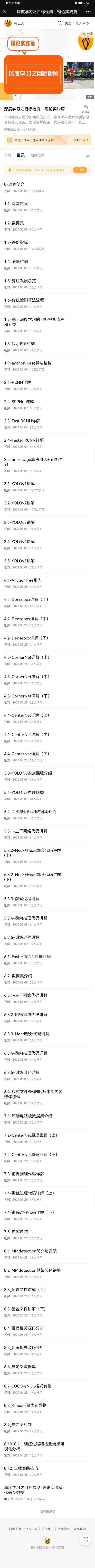 理论部分内容包括:目标检测相关基础,包括流程与评价指标,two-stage算法-Faster RCNN系列详解、one-stage算法-YOLO系列详解,Anchor-free算法系列详解(包括Densebox,CenterNet,CornetNet等);