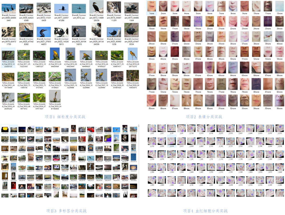 实践部分:一共已经包含了5个实践案例,分别为人脸表情分类基本模型与ResNet实战,动物细粒度分类实战,生活用品多标签图像分类实战,基于血红细胞的图像分类竞赛技巧,从4大方向基于Pytorch实战来详解图像分类任务实践。
