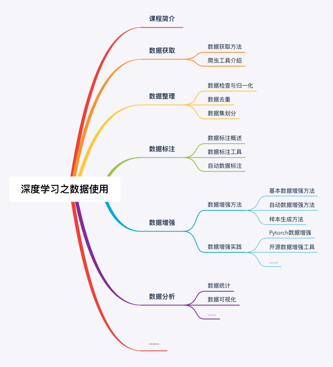《深度学习之数据使用:理论实践篇》的内容包括数据的获取,数据的整理,数据的标注,数据增强,数据的分析等领域,覆盖了深度学习中数据使用的各个方向,大纲如下: