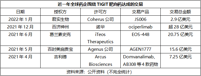 近一年,TIGIT靶向药深得药企“青眼”,全球药企围绕TIGIT靶向药至少达成了4项授权许可(详见下表),其中百济神州与诺华之间的交易更是刷新了我国创新药License-out交易记录。