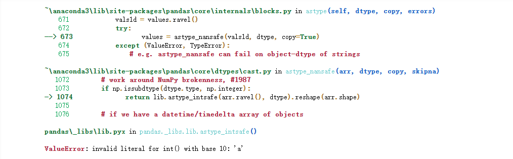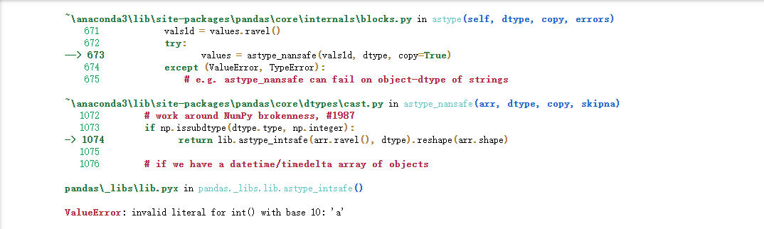 同理我们也可以指定转换成astype('float16')、astype('float32')或者是astype('float128')而如果数据类型的混合的,既有整型又有字符串的,正常来操作就会报错,如下df['mix_col'] = df['mix_col'].astype('int')