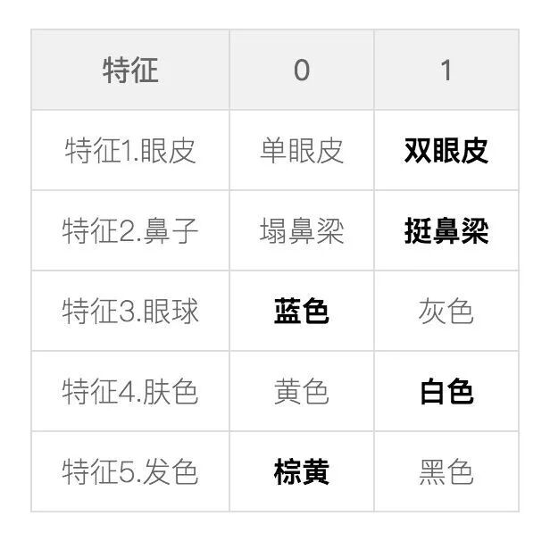 一位双眼皮,挺鼻梁,蓝眼睛,白皮肤,瓜子脸的小姐姐即可用特征表示为(见表格加粗项):(1,1,0,1,0)那么遍历上面这张特征表格一共可以代表32张不同的脸。32 张脸可远远不够覆盖70 多亿的人口。为了让不同特征组成的人脸能覆盖足够多人脸,我们需要扩充上面那张特征表。扩张特征表可以从行、列两个角度展开。列的角度很简单,只需要增加特征数量:(特征6.脸型,特征7.两眼之间距离,特征8.嘴唇厚薄…)实际应用中通常应用 128,256,512 或者 1024 个不同特征。从行的角度扩充也很好理解,比如“特征3”,除了值 0 代表蓝色,值 1 代表灰色,是不是可以增加一个值 2 代表黑色,值 3 代表没有头发呢?此外,除了这些离散的整数,我们也可以取连续的小数,比如特征 3 的值 0.1,代表“蓝中略微带黑”,值 0.9 代表“灰中带蓝”……