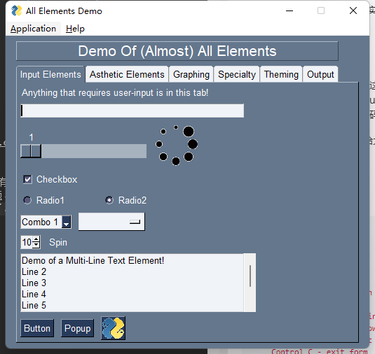 input_layout = [[sg.Menu(menu_def, key='-MENU-')], [sg.Text('Anything that requires user-input is in this tab!')], [sg.Input(key='-INPUT-')], [sg.Slider(orientation='h', key='-SKIDER-'), sg.Image(data=sg.DEFAULT_BASE64_LOADING_GIF, enable_events=True, key='-GIF-IMAGE-'),], [sg.Checkbox('Checkbox', default=True, k='-CB-')], [sg.Radio('Radio1', "RadioDemo", default=True, size=(10,1), k='-R1-'), sg.Radio('Radio2', "RadioDemo", default=True, size=(10,1), k='-R2-')], [sg.Combo(values=('Combo 1', 'Combo 2', 'Combo 3'), default_value='Combo 1', readonly=True, k='-COMBO-'), sg.OptionMenu(values=('Option 1', 'Option 2', 'Option 3'), k='-OPTION MENU-'),], [sg.Spin([i for i in range(1,11)], initial_value=10, k='-SPIN-'), sg.Text('Spin')], [sg.Multiline('Demo of a Multi-Line Text Element!\nLine 2\nLine 3\nLine 4\nLine 5\nLine 6\nLine 7\nYou get the point.', size=(45,5), k='-MLINE-')], [sg.Button('Button'), sg.Button('Popup'), sg.Button(image_data=sg.DEFAULT_BASE64_ICON, key='-LOGO-')]]