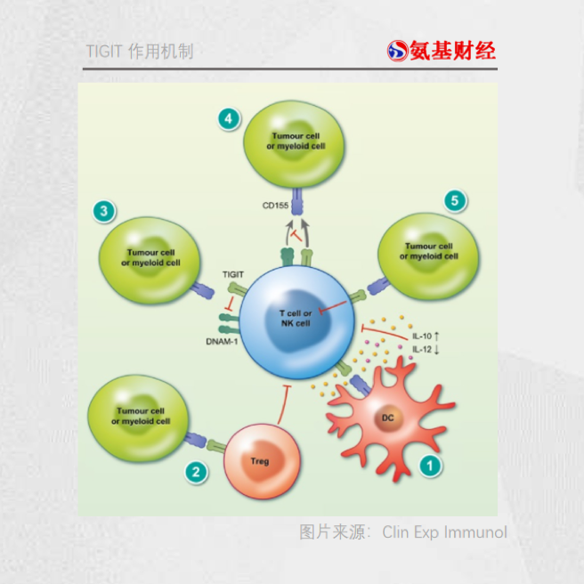 CD155是TIGIT的配体,其在树突细胞中表达。当CD155与TIGIT结合后,会向树突细胞传递信号,通过上调IL-10以及下调IL-12的分泌来减弱树突细胞介导的免疫反应,T细胞活性随之下降。