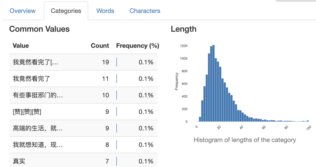 评论的长度分布大多数评论的字数在 20 以内,基本不超过 40 个字,说明都是短文本。