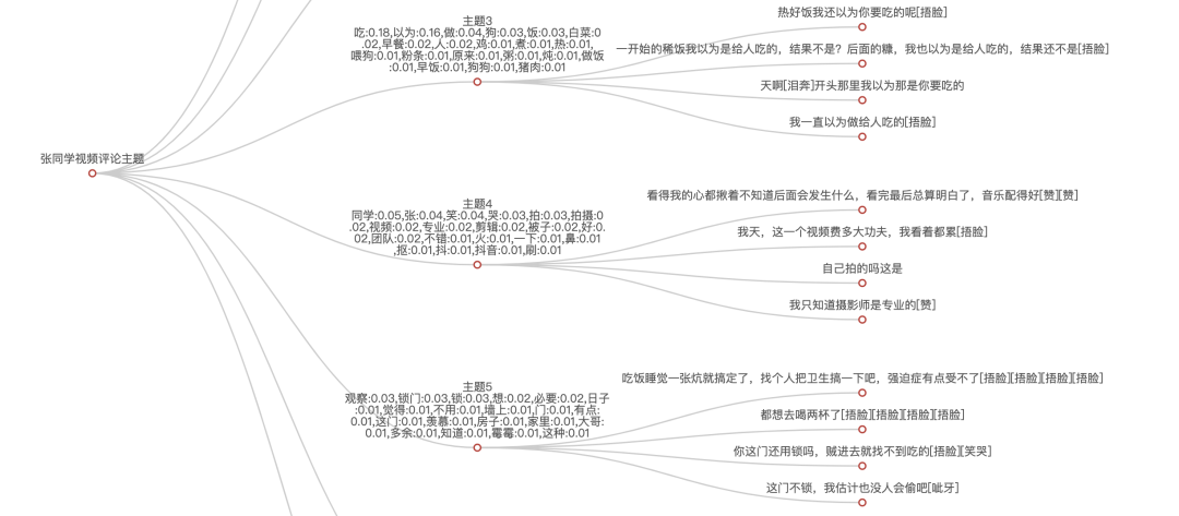 主题占比红色的是主题3(喂狗),占比最大,很多人评论是:以为要做给自己吃,没想到是喂狗的。我看的时候也是这样认为的。