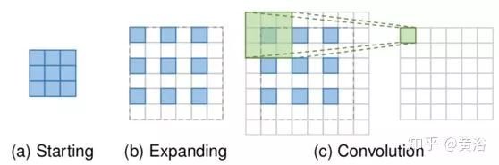 转置卷积层,即反卷积层,基于尺寸类似于卷积层输出的特征图来预测可能的输入。具体地说,它通过插入零值并执行卷积来扩展图像,从而提高了图像分辨率。为了简洁起见,以3×3内核执行2次上采样为例,如图所示。首先,输入扩展到原始大小的两倍,其中新添加的像素值被设置为0(b)。然后应用大小为3×3、步长1和填充1的内核卷积(c)。这样输入特征图实现因子为2的上采样,而感受野最多为2×2。