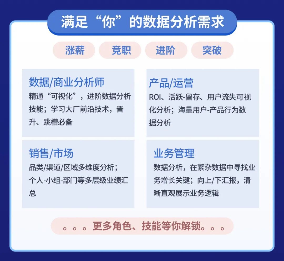 无论你是做数据分析师、运营、销售、还是业务管理,95%的工作岗位都需要对业务进行数据分析。面对数据化的时代,数据分析将成为未来你的职场必备技能。04