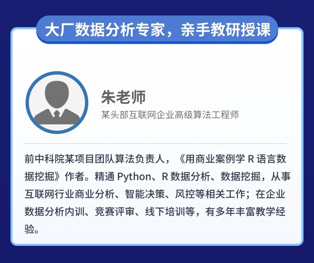 本次训练营的授课老师——朱老师,某头部互联网企业高级算法工程师,前中科院某项目团队算法负责人,《用商业案例学R语言数据挖掘》作者。精通Python、R数据分析、数据挖掘,从事互联网行业商业分析、智能决策、风控等相关工作;在企业数据分析内训、竞赛评审、线下培训等,有多年丰富教学经验。