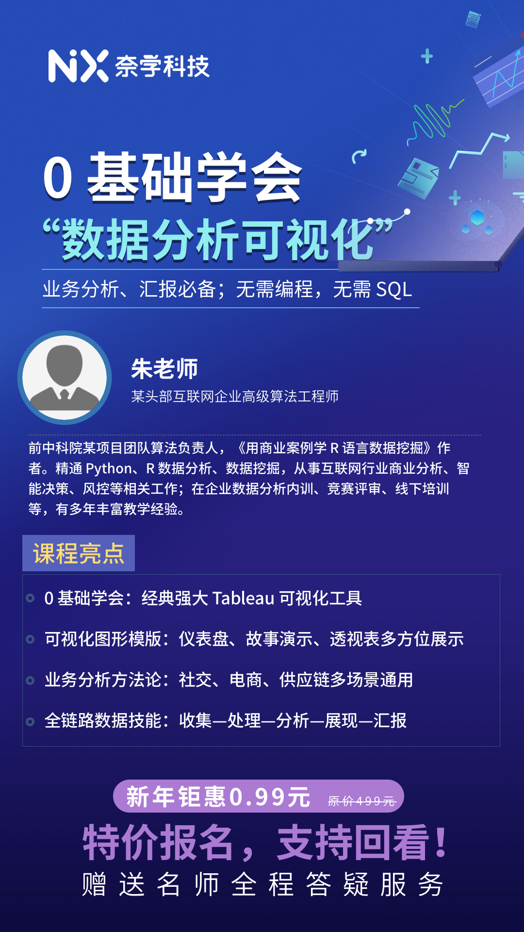 这里推荐一门《数据分析可视化3天训练营》,3天的时间,由某头部互联网企业高级算法工程师朱老师手把手教你多种数据分析可视化与业务分析方法论。无需编程,无需SQL,轻松读取百万行的数据、多场景下实现全局数据联动,轻松制作动态图表......最重要的是,零基础小白也能快速上手,只需0.99元 即可加入,限时抢购!(上课赠Tableau安装包,安心学!)