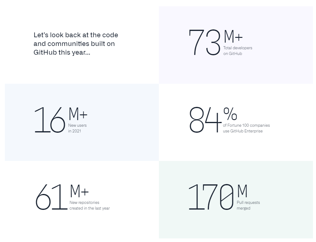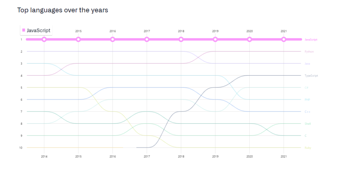 岁末年初,又是各大网站自我总结的时候了,有一个网站的总结尤其牵动着广大程序员的心,那就是GitHub。GitHub在去年11月就早早公布了他们的Octoverse 2021年度报告,但迈入2022后,一起来回顾一下7300万开发者在2021年搞了哪些「开源事」吧!2021年的GitHub报告比往年的数据量更大,包括400万的代码仓库和1.2万受访开发者。报告显示,GitHub的开发者数量目前已经飙升到了7300万,而在2020年的9月,这个数字还只有5600万,2019年为4000万。并且世界财富 100 强企业中的 84% 都在使用 GitHub。GitHub曾预计2025年用户数量将会达到1亿,现在看起来,1亿程序员内卷时代要更早到来了。对活跃用户所在地进行统计可以发现,在全球总开发者中,来自北美洲的最多,占比达到31.5%,其次是亚洲31.2%,之后是欧洲27.3%.换句话说,代码仓库中近 70% 的活跃用户来自北美以外。美国以外用户数量增长最快的国家和地区包括印度尼西亚、巴西、印度、俄罗斯、日本、德国、加拿大、英国和中国。 过去一年里,从开发者分布来看,43.2% 的 GitHub开发者来自北美,其次是欧洲(33.5%)和亚洲(15.7%)。其中美国开发者最多,共有1355万,中国次之,共有755万GitHub开发者。而 2020 年,来自中国的开发者还只有 652万,其中来自印度的 GitHub 用户总数比去年同期增长了 38.9%.。开源项目的首次贡献者数量也是在逐年增长,相较于2020年,2021年增加了21.3万名首次开源项目贡献者。从编程语言的使用来看,Javascript从2014年以来一直稳坐头一把交椅,而Python也是万年老二,Java依然排第三位。在微软的维护下,新兴编程语言TypeScript 已经从2018年和2019年的第七位攀升到今年的第四位,未来可期!而PHP 和 Ruby 这两种五年前最受欢迎的语言的受欢迎程度继续下降。可以看到,从 2017 年开始, C#、PHP、C++这些开发者以往使用更多的编程语言逐渐被 TypeScript 赶超,与 C/C++, Java 等静态类型语言不同的是,TypeScript 既具有 IDE 全方位的开发辅助和严格的代码检查的静态优势,又能让代码像 JavaScript 一样简洁和灵活,这也是开发者越来越倾向于使用 TypeScript 的原因之一。排名前十的编程语言中,只有 Shell 和 C 的位置与去年相比发生了变化:Shell 取代了 C 语言上升至第 8 位。