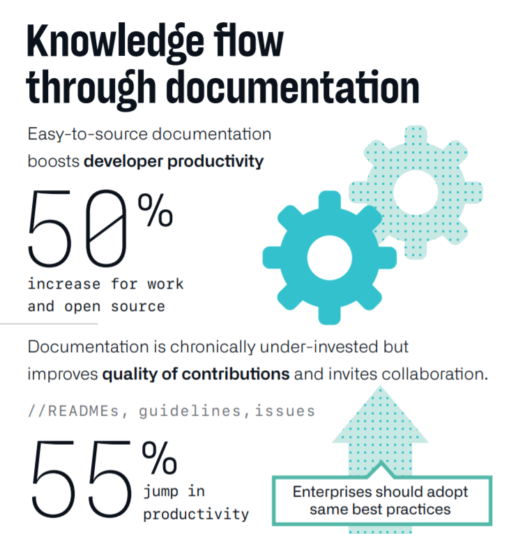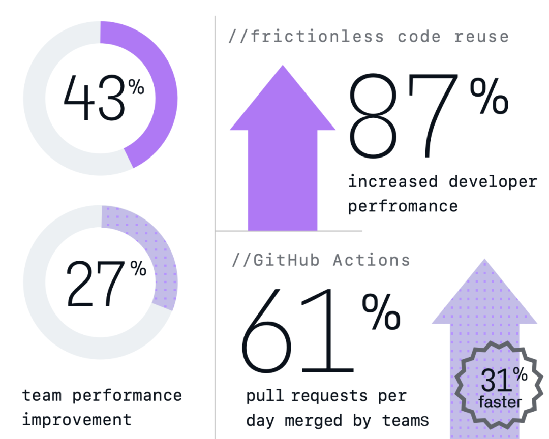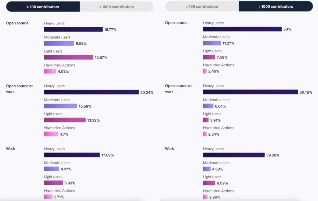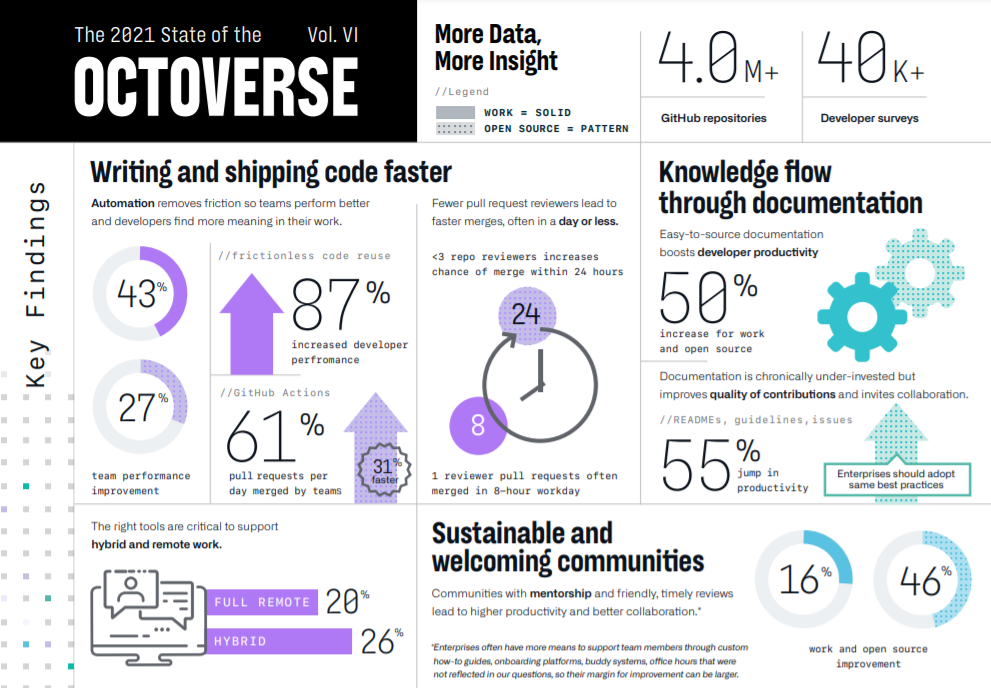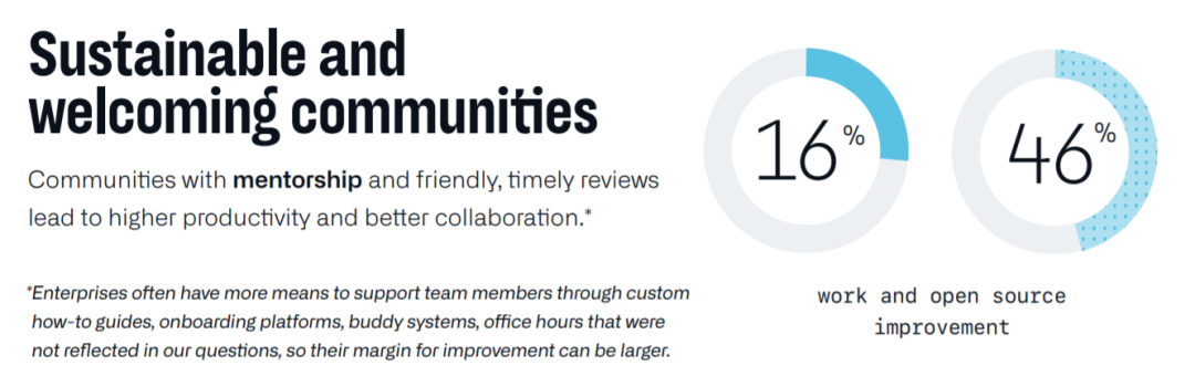 除了对编程语言和开发者的调查外,Github 还对比了疫情前后工作场地的变化。调查结果显示,2021 年生产力开始恢复到疫情之前的水平,而工作场所正在发生变化。当受访者被问及他们在疫情之前是如何工作的,以及在疫情之后他们希望如何与他人协作时,只有大约 11%的受访者希望回到办公室工作,比之前的 41%减少了 30%。在新冠疫情仍然严峻的情况下,更多开发者选择了利用Github远程工作。调查结果显示,过去一年里,有20%的Github开发者选择了完全远程开发,26%的开发者选择现场与远程开发结合的方式。2021年GitHub根据调查数据创建了预测模型,以便于帮助理解团队在软件开发和交付中使用不同实践的影响,分别是:更快速编写和发送代码、创建文档,以及支持可持续社区。调查结果显示,Github上代码编写和生成的自动化程度显著提高,这使得不同团队之间的协作更方便,开发者的工作价值更易实现。并且实践自动化也消除了大量的分歧和重复性任务,使得团队在开源方面的表现提高了 27%,在工作项目完成度上提高了 43%,无缝代码重用让开发者的效率提升了87%。GitHub 上的开发者模式反映了自动化软件交付是开源的关键推动因素,能帮助团队在规模上更快地发展。可以看到,大型存储库使用 Actions 的比例高于中小型库。数据显示,一旦大型存储库开始使用 Actions,团队每天合并的拉取请求比以前增加了近 2 倍(增加了 61%),合并速度提高了 31%。在所有开源存储库中,使用 Actions 将合并拉取请求的数量增加了 36%,并将合并时间缩短了 33%。在过去的一年里,GitHub总共merge了1亿7000万个pull request,创建了6100万个新仓库,可以看出开发者代码的上传速度大幅提升。开发团队每日合并的拉取请求数量提高了61%。开发者更少的项目,合并速度更快,一般不到1天即完成合并。无论是对公司项目,还是开源项目,友好的评论和及时的指导都是极其重要的。对于大型代码存储库,使用Good First Issue 标签可以吸引更多贡献者。调查结果显示,当21%-30%的问题被标记为 Good First Issues 的存储库时,就会有大约 13% 的新贡献者加入到代码开发;有超过 40% 的 Good First Issues 标注就可以帮助项目吸引 21% 以上的新贡献者。工具与说明文档在提升开发者生产力上也功不可没。报告显示,受益于这类工具和文档,开源库和企业项目开发者的平均产出提升了50%。在过去相当长的一段时间里,说明文档、Readme等辅助技术资料的意义一直被低估了。报告显示,2021年,这类辅助说明文档让Github开发者的产出大幅跃升了55%,为了提升效率,企业也应该在项目开发中多增设这类文档。还有一点容易被忽略:高效的搜索算法固然很好,但可搜索性也是一致的代码标准和命名约定的产物。数据显示,当开发人员可以轻松找到他们需要的东西时,他们感到有能力完成工作的可能性要高出近 60%。此外,只需拥有一个易于搜索的团队存储库,他们就可以将生产力提高 11%.。