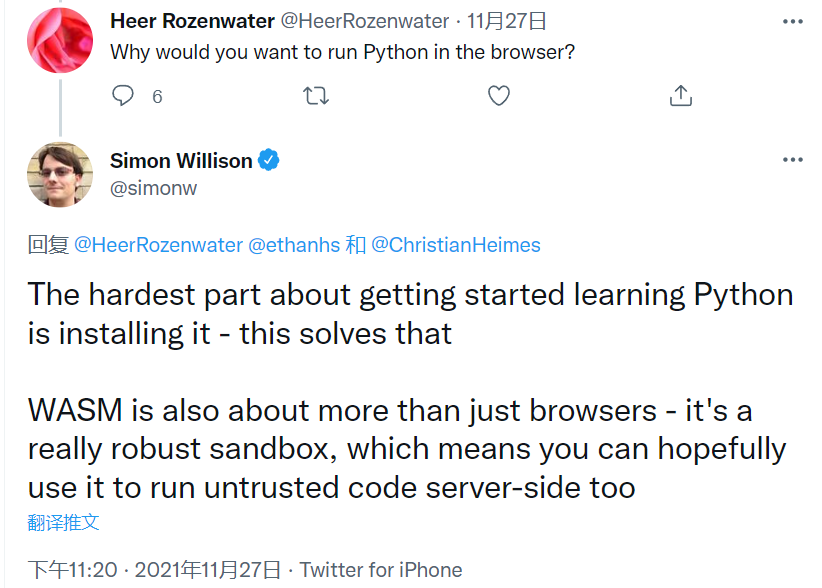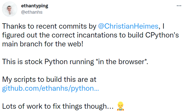 Mypy 项目核心团队的成员 ethanhs 发表推特称,得益于 Python 团队核心开发者 @ChristianHeimes 最近提交的 commit,他找到了构建用于 Web 的 CPython 主分支的正确方法。ethanhs 表示,虽然已经顺利在浏览器中运行了 CPython,不过还有很多工作要做。此外他构建的脚本也已开源:https://github.com/ethanhs/python-wasm。Python 之父“龟叔”也在评论区对该项目表示了肯定,他还提到可以考虑将 CPython on WASM 与 github.dev 集成,实现在浏览器中进行 Python 代码。当然也有人不太理解这个项目,他提问称,为什么要在浏览器中运行 Python?Django 联合创始人 Simon Willison 则回复道,开始学习 Python 最难的部分是安装 Python,这个项目已经解决了此问题。