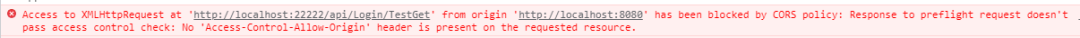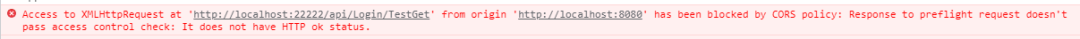 情况2: Access to XMLHttpRequest at 'http://localhost:22222/api/Login/TestGet' from origin 'http://localhost:8080' has been blocked by CORS policy: Response to preflight request doesn't pass access control check: It does not have HTTP ok status.