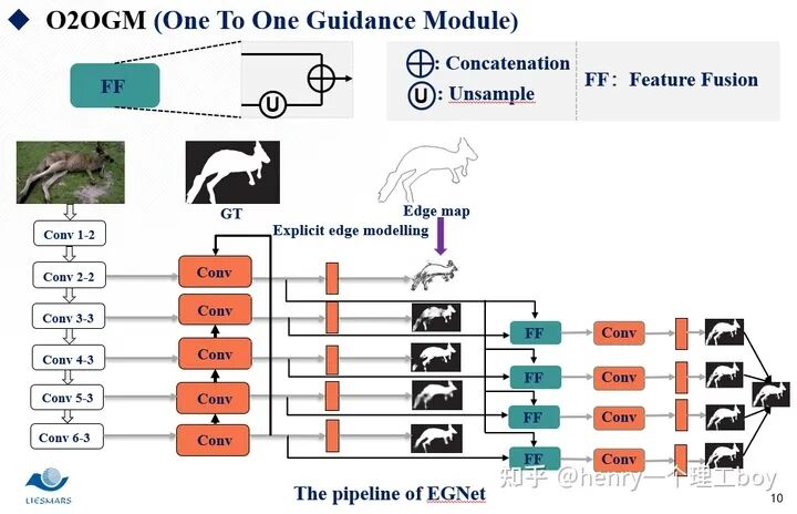 最后是O2OGM模块,将Conv6-3提取的显著性目标特征信息与Conv2-2提取的边缘特征结合后的特征分别与Conv3-3、Conv4-3、Conv5-3、Conv6-3每层提取的显著性目标特征进行融合,即图中FF模块的操作。FF操作很简单,就是将高层特征上采样然后进行拼接的操作,就可以达到融合的效果。