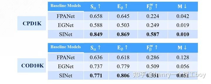 可以看出,在精度指标的评价方面,SINet相比于其他两种方法都有很大提升,而PFANet模型结构虽然很简单,但他的效果也是最差的。