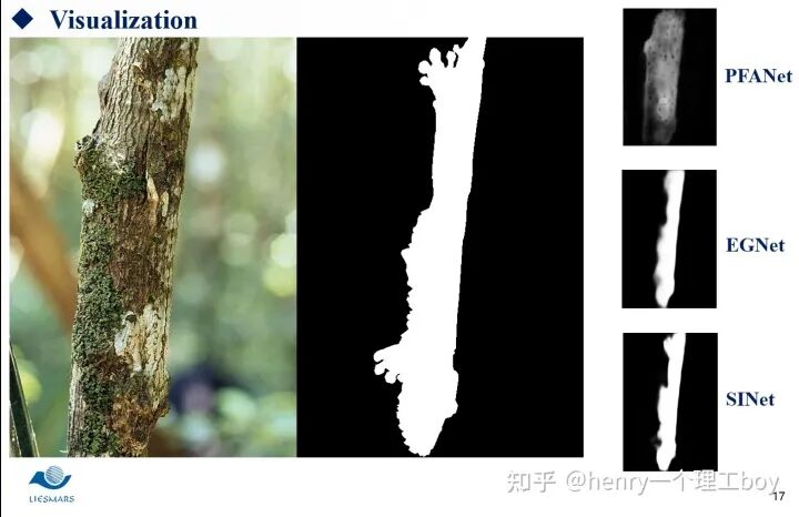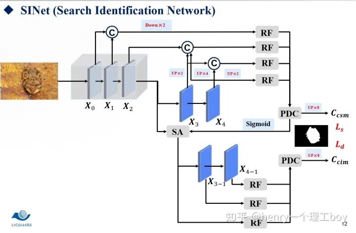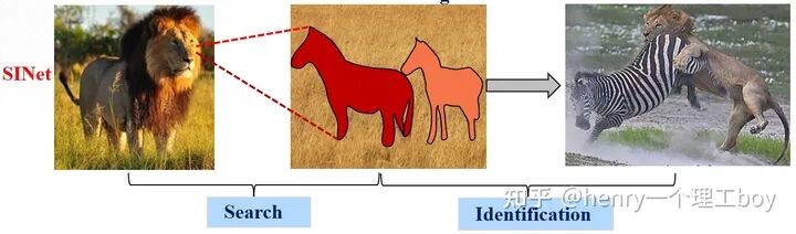 接下来我将介绍一个用于伪装目标检测的网络SINet。假设你是一头饥肠辘辘的雄狮,此刻你扫视着周围,视线突然里出现了两匹斑马,他们就是你今天的猎物,美食。确定好了目标之后,那么就开始你的猎杀时刻。所以整个过程是你先扫视周围,我们称之为搜索,然后,就是确认目标,开始猎杀,我们称之为确认。我们的SINet就是这样的一个结构,他分为搜索和确认两个模块,前者用于搜索伪装目标,后者用于精确定位去检测他。