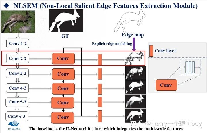 然后是NLSEM模块,采用骨架中的Conv-2-2提取目标的边缘特征。不使用Conv1-2是因为其太接近输入层(噪声多)并且其感受野较小,不使用Conv3-3及更深的层提取边缘特征是因为他们所得到的feature map包含的边缘信息较少,他们更多包含的是语义信息。