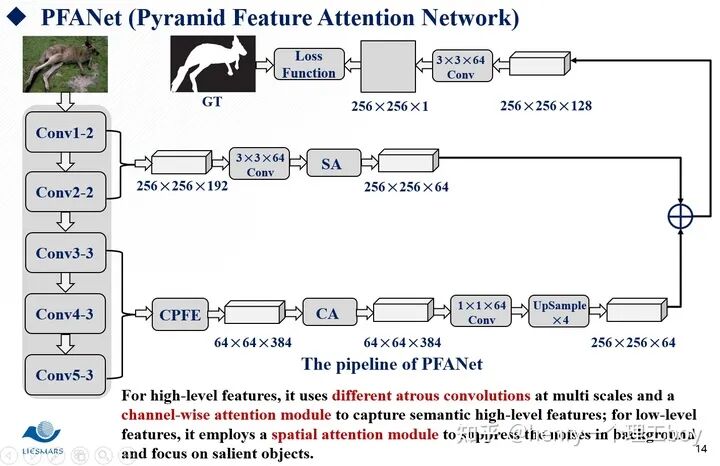 PFANet的结构相对简单,采用VGG网络作为特征提取网络,然后将前两层特征称为低层特征,后三层特征称为高层特征,对他们采用了不同的方式进行特征增强,以增强检测效果。
