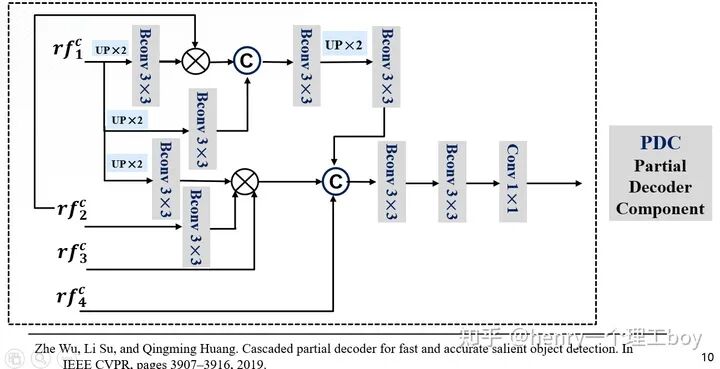 我们用RF对感受野增大来进行搜索,那么搜索过后,我们得到了增强后的候选特征。我们要从候选特征得到我们最后要的伪装目标的检测结果,这里我们用到的方法是PDC模块(即是部分解码组件)。