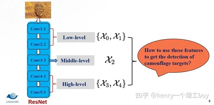 我们现在就具体来看看我们的SINet到底是怎么一回事。首先,我们都知道低层特征有着较多的空间细节,而我们的高层特征,却有着较多的语义信息。所以低层的特征我们可以用来构建目标区域,而高层特征我们则可以用来进行目标定位。我们将这样一张图片,经过一个ResNet的特征提取器。按照我们刚才的说法,于是我们将前两层称为低层特征,最后两层称之为高层特征,而第三层我们称之为中层特征。那么有了这样的五层特征图,东西已经给我们了?我们该怎么去利用好这些东西呢?
