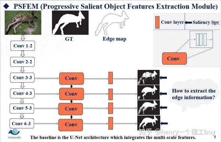 下面我们来详细看一下各个结构,首先是PSFEM。EGNet采用的结构是U-net的结构,将六个特征层,依次进行卷积的操作,然后再经过一个卷积层。从Conv3-3、Conv4-3、Conv5-3、Conv6-3四条路径分别提取目标不同层次的特征信息。其中从骨架最后一层的Conv6-3提取的特征卷积后与边缘信息结合用于O2OGM模块;Conv3-3、Conv4-3、Conv5-3、Conv6-3之间都一个从深层到上一浅层的连接(从Conv6-3开始,Conv3-3结束),用来丰富特征信息。