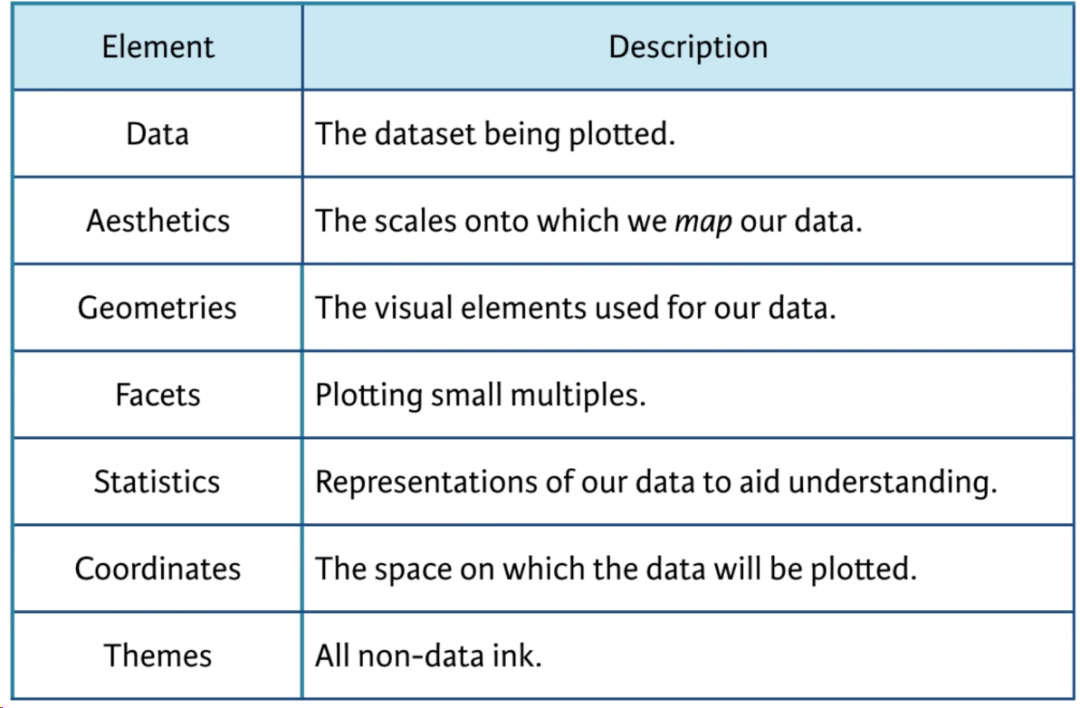 ggplot2是R语言最流行的第三方扩展包,是RStudio首席科学家Hadley Wickham读博期间的作品。根据其绘图理念,图形由以下几个模块组成: