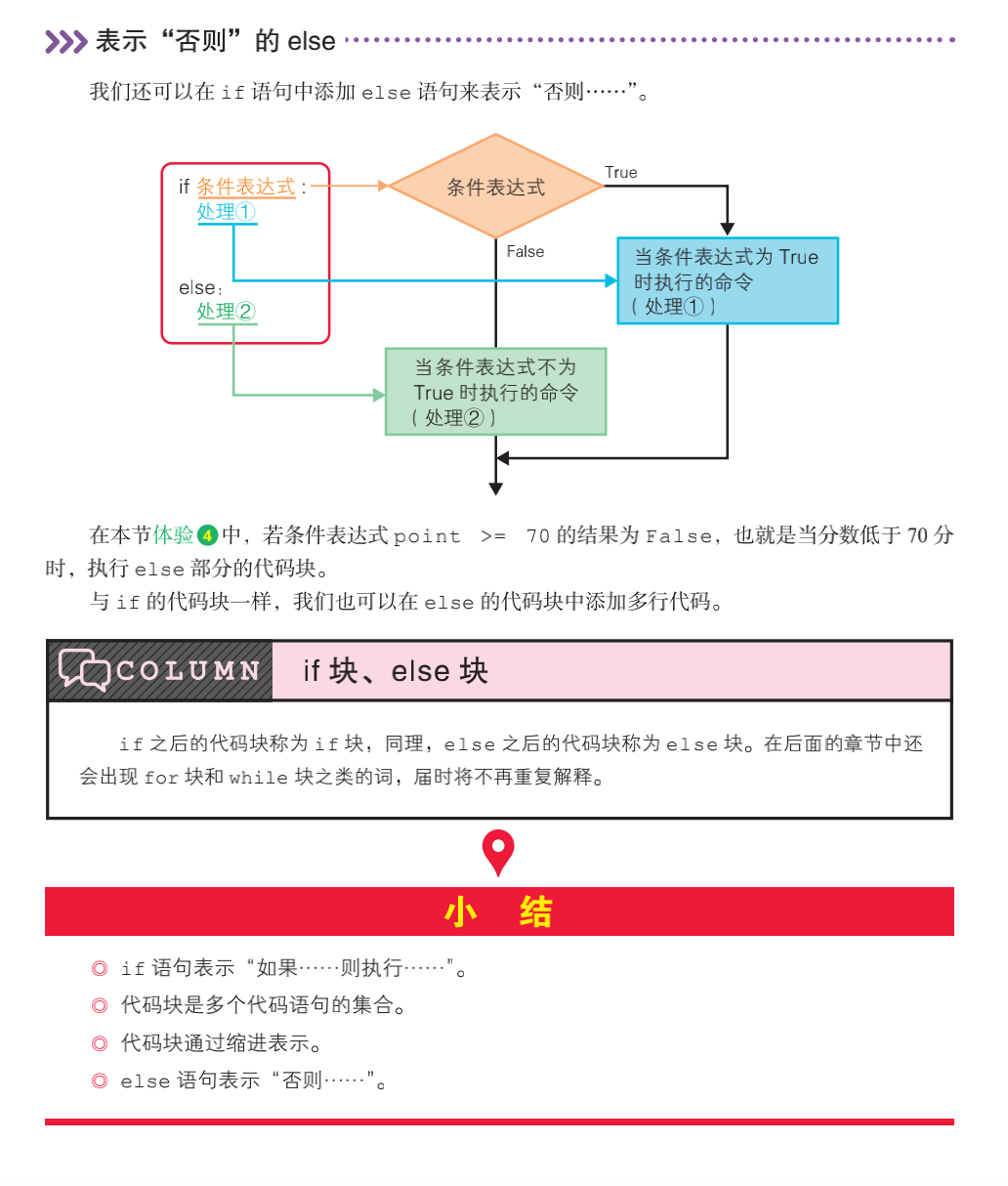 在“预习”环节概述该节内容,在“体验”环节实际带领大家创建 Python 程序并运行,在“理解”环节结合插图详细讲解该节的重点知识和代码内容。