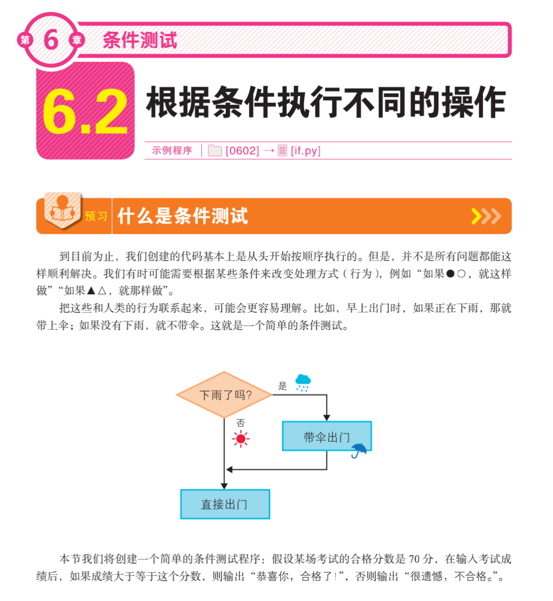 下面,我们以本书第六章第二节为例,了解本书的使用方法,并尝试从预习、体验、理解三个步骤学习 Python。