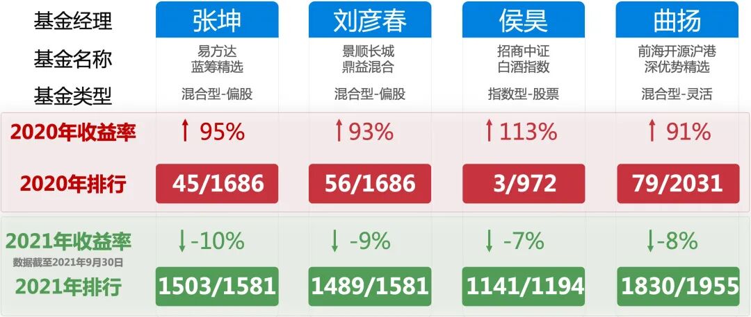 无独有偶,还有很多在2020年排名靠前的明星基金经理在21年都表现得不尽如人意,收益普遍拉胯。