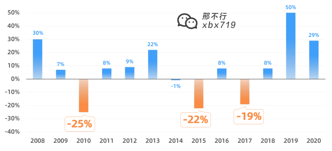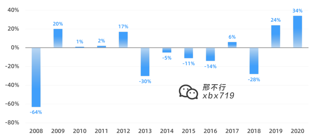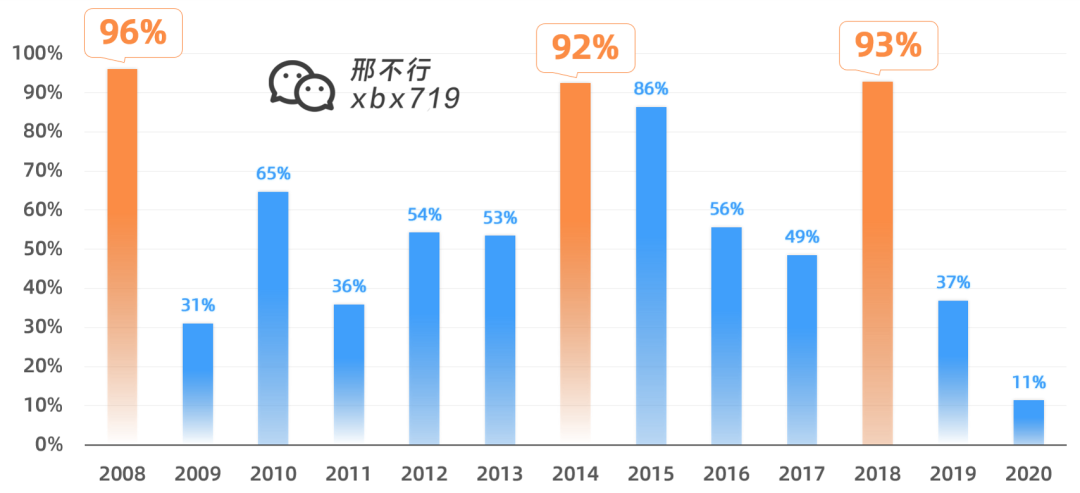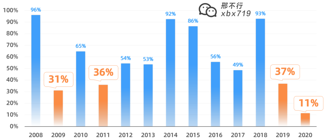 可以看出最惨烈的是2008年,次年收益跑输了大盘64%。