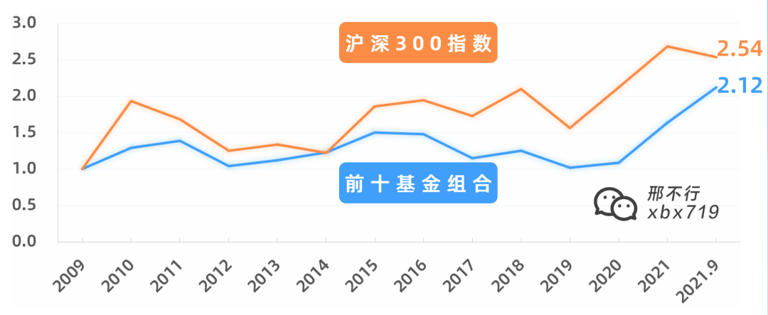 蓝线代表了我们前十基金组合。假设在2009年初始投入1元买入该组合,经过这么多年的辗转反侧,最终变为2.12元,本金翻了一倍。