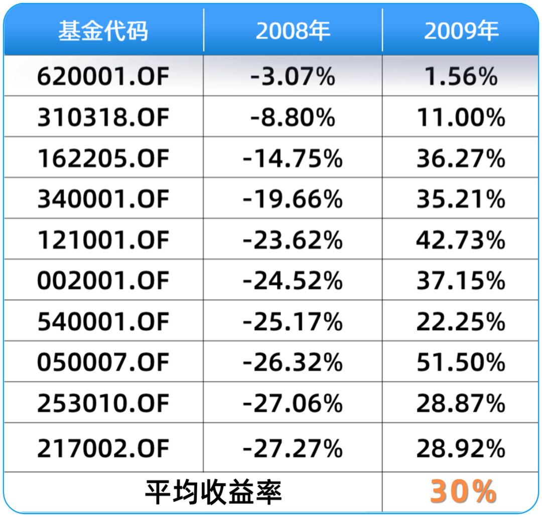 比如2010年前十基金的次年平均收益率虽然只有-25%,但同期大盘下跌26%,对比下来还跑赢了大盘1%。