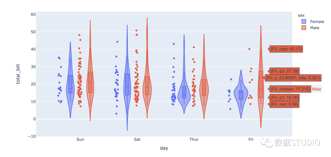 较低/较高的相邻值(黑色条形图)--分别定义为第一四分位数-1.5 IQR和第三四分位数+1.5 IQR。这些值可用于简单的离群值检测技术,即位于这些 "栅栏"之外的值可被视为离群值。 plotly code import plotly.express as px df = px.data.tips() fig = px.violin(df, y=