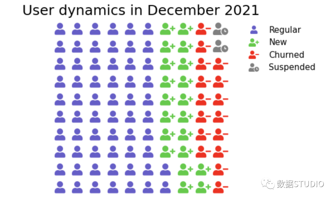 from pywaffle import Waffleimport matplotlib.pyplot as plt plt.figure(figsize=(15 ,8 )) dict_users = {'Regular' : 62 , 'New' : 20 , 'Churned' : 16 , 'Suspended' : 2 } df = pd.Series(dict_users) colors_list = ['slateblue' , 'limegreen' , 'red' , 'grey' ] colors = {df.index[i]:colors_list[i] for i in range(len(df))} fig = plt.figure(FigureClass=Waffle, figsize=(10 ,5 ), values=dict_users, rows=10 , colors=list(colors.values()), icons=['user' ,'user-plus' , 'user-minus' , 'user-clock' ], font_size=22 , icon_legend=True , legend={'bbox_to_anchor' : (1.55 , 1 ), 'fontsize' : 15 , 'frameon' : False }) plt.title('User dynamics in December 2021' , fontsize=25 ) plt.show()