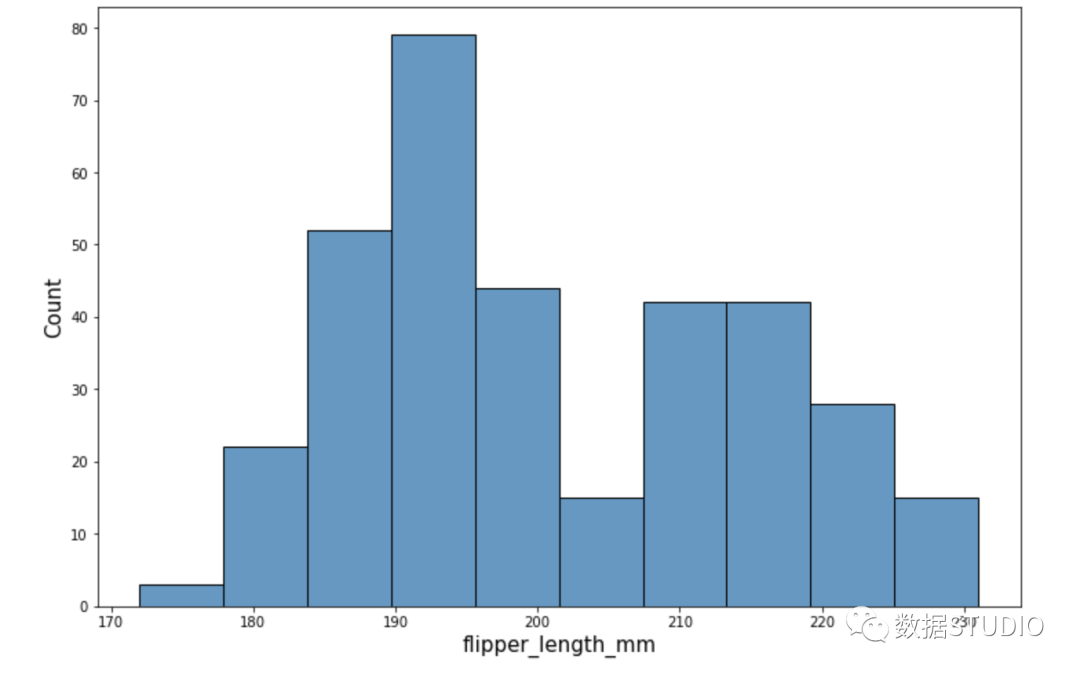 seaborn code import seaborn as sns sns.set_context({'figure.figsize' :[12 , 8 ]}) penguins = sns.load_dataset("penguins" ) ax = sns.histplot(data=penguins, x="flipper_length_mm" ) ax.xaxis.label.set_size(15 ) ax.yaxis.label.set_size(15 )