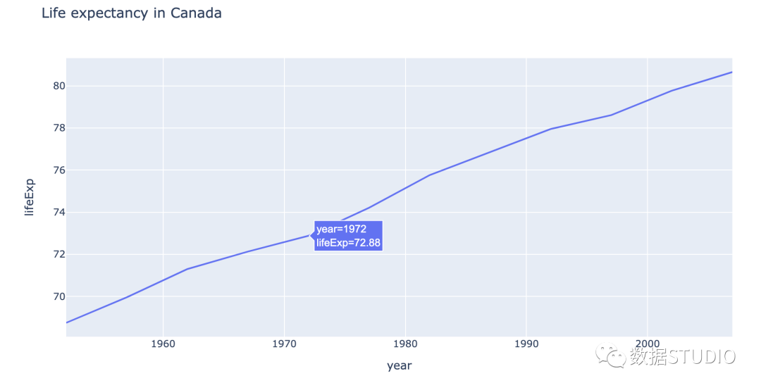 import plotly.express as px df = px.data.gapminder().query("country=='Canada'" ) fig = px.line(df, x="year" , y="lifeExp" , title='Life expectancy in Canada' ) fig.show()