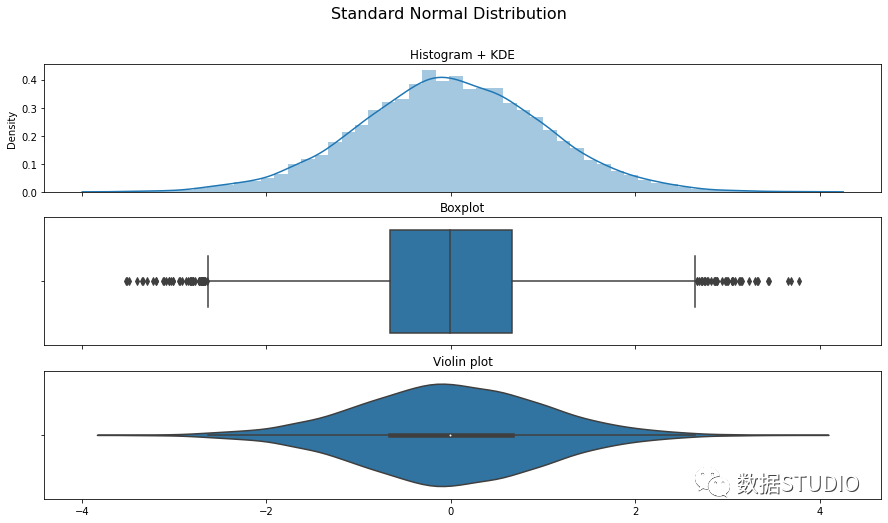 matplotlib code import numpy as npimport matplotlib.pyplot as pltimport seaborn as sns N = 10 **4 x = np.random.normal(size=N) fig, ax = plt.subplots(3 , 1 ,figsize=(15 ,8 ), sharex=True ) sns.distplot(x, ax=ax[0 ]) ax[0 ].set_title('Histogram + KDE' ) sns.boxplot(x, ax=ax[1 ]) ax[1 ].set_title('Boxplot' ) sns.violinplot(x, ax=ax[2 ]) ax[2 ].set_title('Violin plot' ) fig.suptitle('Standard Normal Distribution' , fontsize=16 ) plt.show()