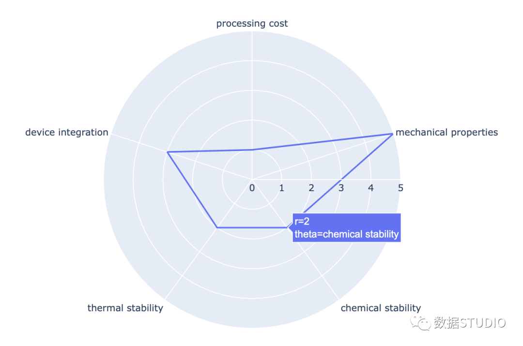 Plotly code import plotly.express as pximport pandas as pd df = pd.DataFrame(dict( r=[1 , 5 , 2 , 2 , 3 ], theta=['processing cost' ,'mechanical properties' , 'chemical stability' , 'thermal stability' , 'device integration' ])) fig = px.line_polar(df, r='r' , theta='theta' , line_close=True ) fig.show()