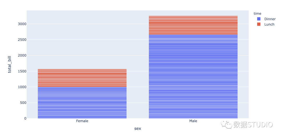 plotly code import plotly.express as px df = px.data.tips() fig = px.bar(df, x="sex" , y="total_bill" , color='time' ) fig.show()