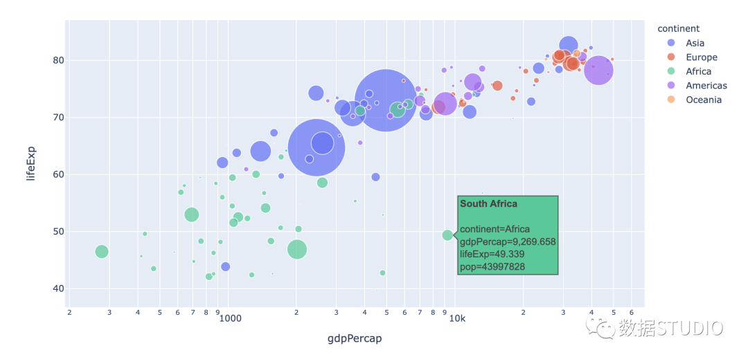 Plotly code import plotly.express as px df = px.data.gapminder() fig = px.scatter(df.query("year==2007" ), x="gdpPercap" , y="lifeExp" , size="pop" , color="continent" , hover_name="country" , log_x=True , size_max=60 ) fig.show()