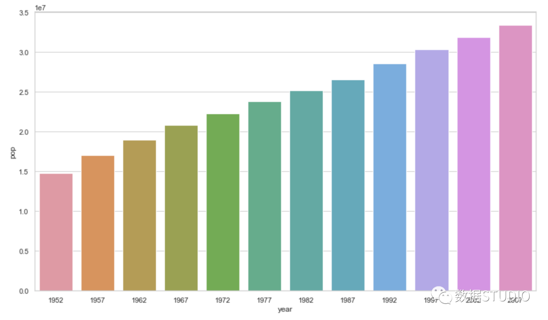 seaborn code import seaborn as sns sns.set_context({'figure.figsize' :[14 , 8 ]}) sns.set_theme(style="whitegrid" ) ax = sns.barplot(x="year" , y="pop" , data=data_canada)