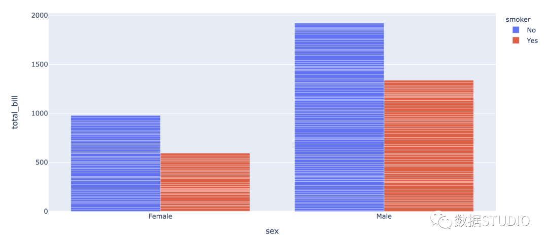 plotly code import plotly.express as px df = px.data.tips() fig = px.bar(df, x="sex" , y="total_bill" , color='smoker' , barmode='group' , height=500 ) fig.show()