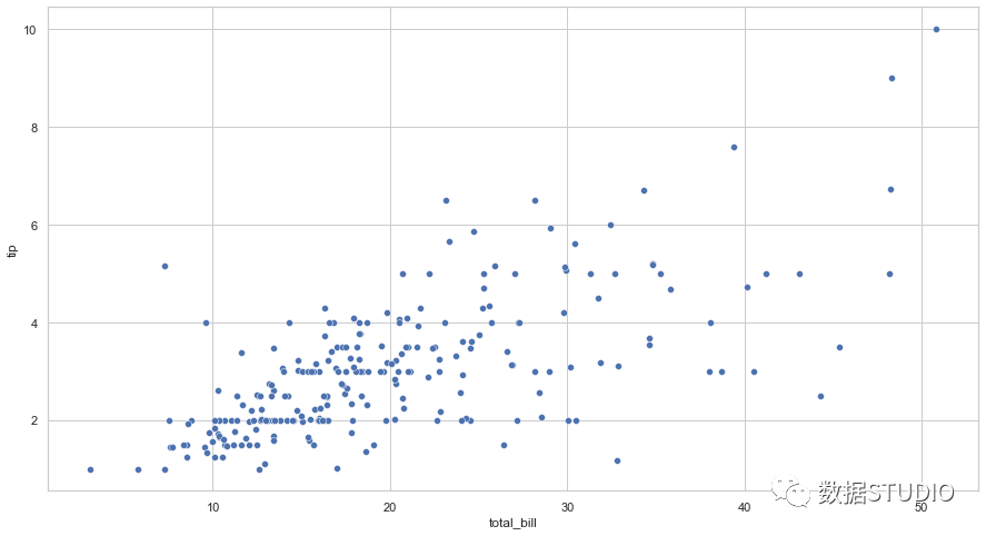 Seaborn code import seaborn as sns tips = sns.load_dataset("tips" ) sns.scatterplot(data=tips, x="total_bill" , y="tip" )