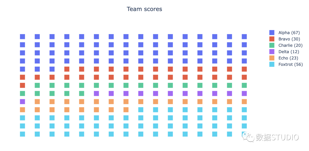 Xlim = 16 Ylim = 13 Xpos = 0 Ypos = 12 ##change to zero for upwards series = []for name, count in ds.iteritems(): x = [] y = [] for j in range(0 , count): if Xpos == Xlim: Xpos = 0 Ypos -= 1 ##change to positive for upwards x.append(Xpos) y.append(Ypos) Xpos += 1 series.append(go.Scatter(x=x, y=y, mode='markers' , marker={'symbol' : 'square' , 'size' : 15 }, name=f'{name} ({count} )' )) fig = go.Figure(dict(data=series, layout=go.Layout( title={'text' : title, 'x' : 0.5 , 'xanchor' : 'center' }, paper_bgcolor='rgba(255,255,255,1)' , plot_bgcolor='rgba(0,0,0,0)' , xaxis=dict(showgrid=False ,zeroline= False , showline=False , visible=False , showticklabels=False ), yaxis=dict(showgrid=False ,zeroline= False , showline=False , visible=False , showticklabels=False ), ))) fig.show()
