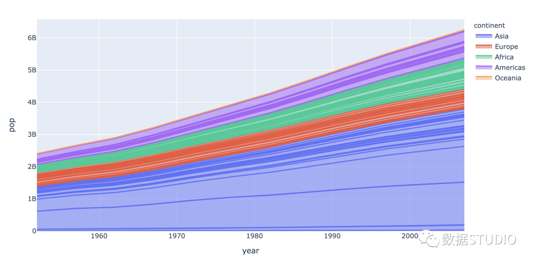 Plotly code import plotly.express as px df = px.data.gapminder() fig = px.area(df, x="year" , y="pop" , color="continent" , line_group="country" ) fig.show()