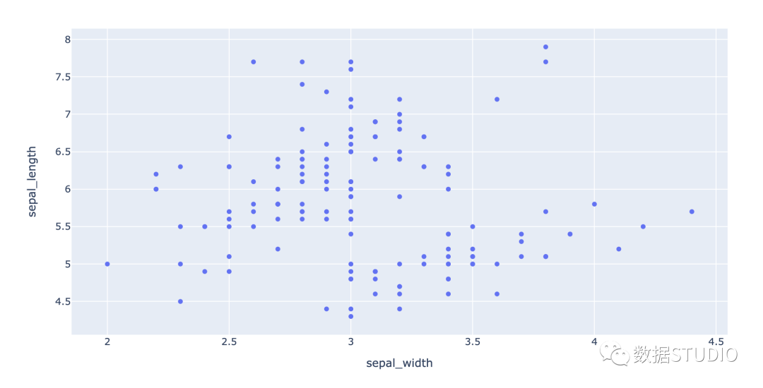 Plotly code import plotly.express as px df = px.data.iris() # iris is a pandas DataFrame fig = px.scatter(df, x="sepal_width" , y="sepal_length" ) fig.show()