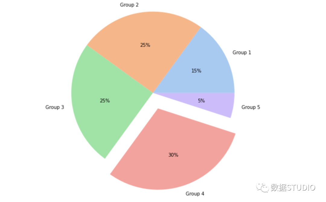 import matplotlib.pyplot as pltimport seaborn as sns data = [15 , 25 , 25 , 30 , 5 ] labels = ['Group 1' , 'Group 2' , 'Group 3' , 'Group 4' , 'Group 5' ] colors = sns.color_palette('pastel' )[0 :5 ] plt.pie(data, labels = labels, colors = colors, autopct='%.0f%%' , explode = [0 , 0 , 0 , 0.2 , 0 ]) plt.show()